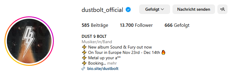 1 Million Aufrufen erstellt und erfolgreich vermarktet.Gemeinsam bauen wir eure Kanäle strategisch auf und entwickeln Content, der eure Zielgruppe begeistert. Ob Instagram, TikTok oder YouTube – ich kenne die Plattformen und ihre Dynamiken genau. Schaut euch meine Referenzen und eigenen Kanäle an, und meldet euch, damit wir eure Social-Media-Präsenz aufs nächste Level bringen! Als Beispiel findet ihr links den Instagram Account der Metal Band „Dust Bolt“ den ich betreue.