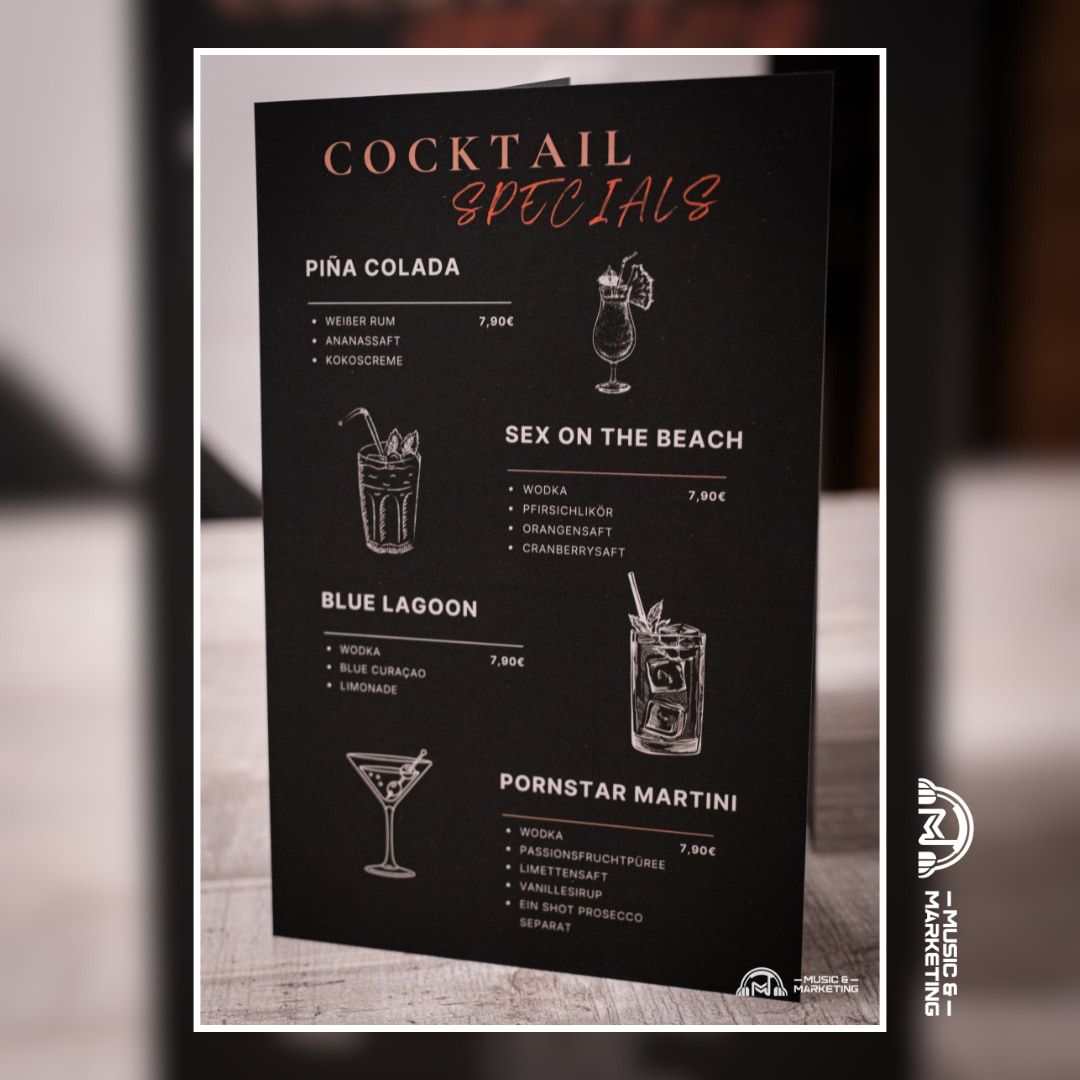 Besonderer Fokus lag auf der Kombination aus klarer Gestaltung, guter Lesbarkeit und einer hochwertigen Ausführung. Die Karten wurden auf strapazierfähigem, cellophaniertem Papier umgesetzt, das nicht nur langlebig ist, sondern auch eine angenehme Haptik bietet. So entstand eine Getränkekarte, die Gäste anspricht, zum Verweilen einlädt und das Gesamterlebnis des Cafés visuell unterstreicht.