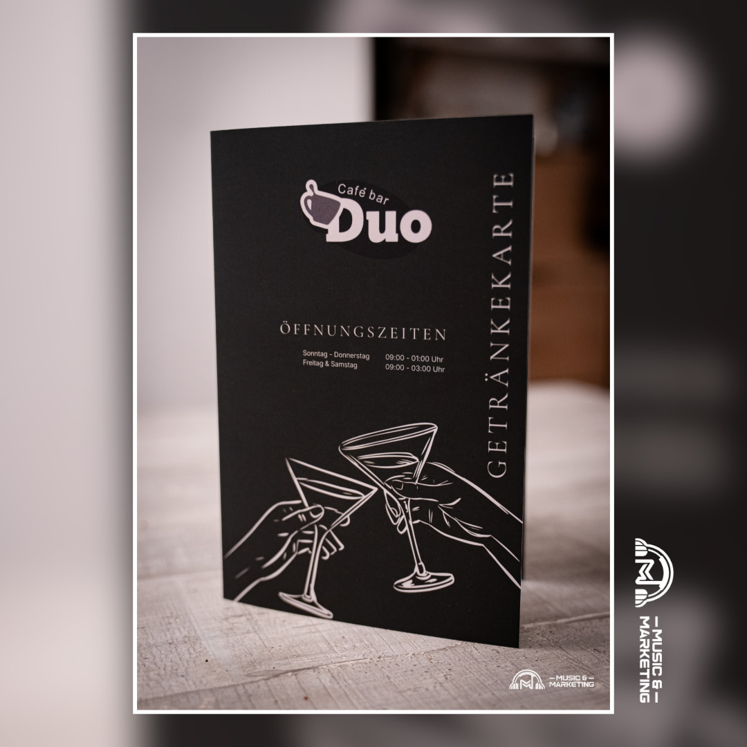 Für das Café Duo in Geretsried haben wir eine Speise-, Getränke- und Cocktailkarte gestaltet, die sowohl optisch überzeugt als auch im täglichen Einsatz funktioniert.